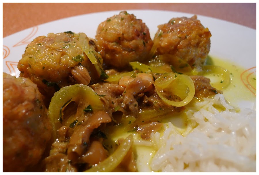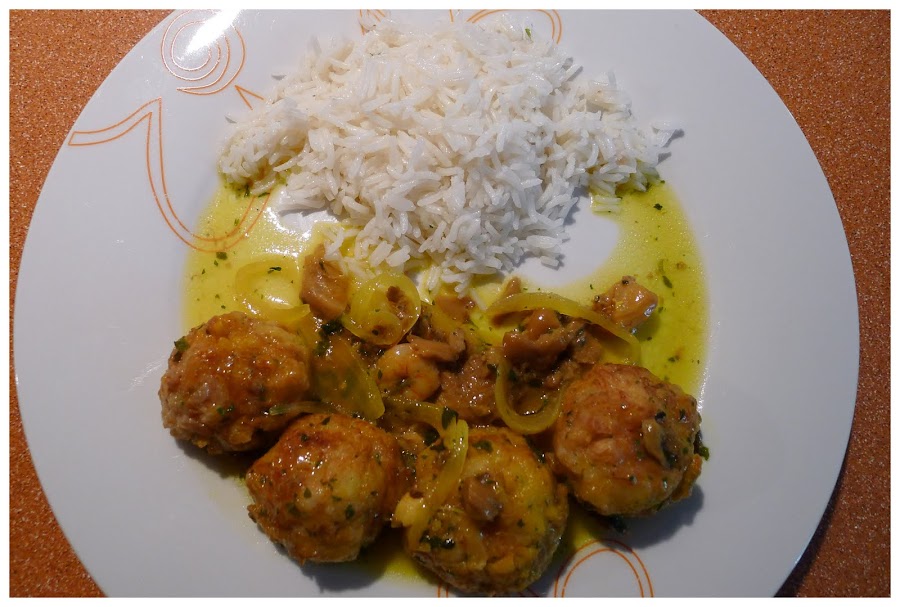 Ahora en una sarten u olla amplia hacemos la salsa.Llevamos al fuego con aceite la cebolla picada en juliana finita y dejamos hacer unos minutos removiendo para que no se nos pegue.Añadimos las albondigas,el vino blanco y el agua a ojo y tapamos.Dejamos que se haga unos minutos y entonces agregamos el avecrem o sal, azafran y como medio bote de las setas con gambas,si no disponeis de el ya sabeis,unas setas y gambitas frescas(las setas entonces las refreiremos junto con la cebolla).