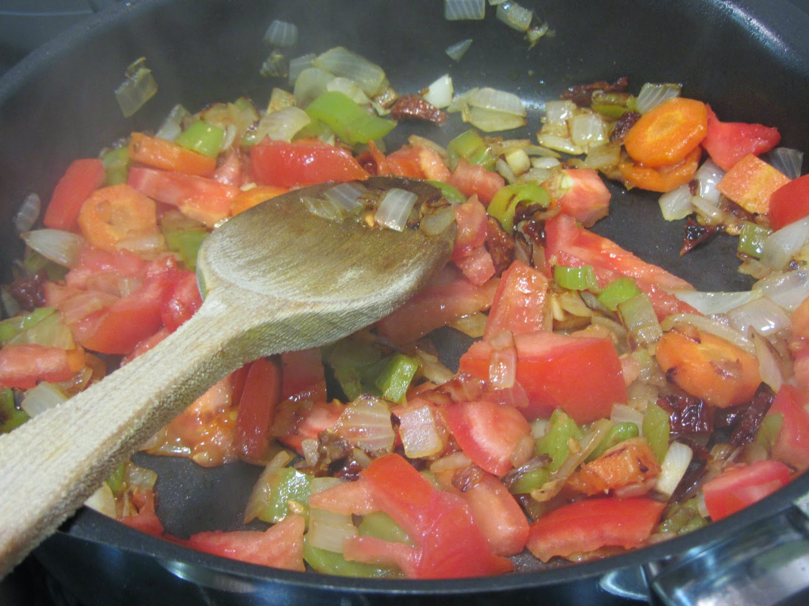 Cuando esté dorada la verdura, agregamos el tomate troceado (Se puede escaldar y pelar previamente si queréis, para no encontrar pielecillas en la salsa, pero si vamos a usar para triturar las verduras un robot potente, tipo Thermomix, no es necesario).