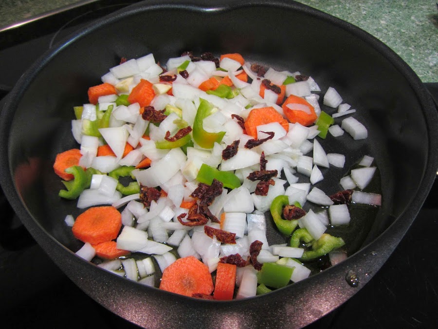 Para la SALSA, picamos la cebolla, el ajo, los tomates secos y el pimiento, y pelamos y cortamos la zanahoria en rodajitas. No hace falta que los trozos sean excesivamente pequeños, puesto que después trituraremos la salsa.