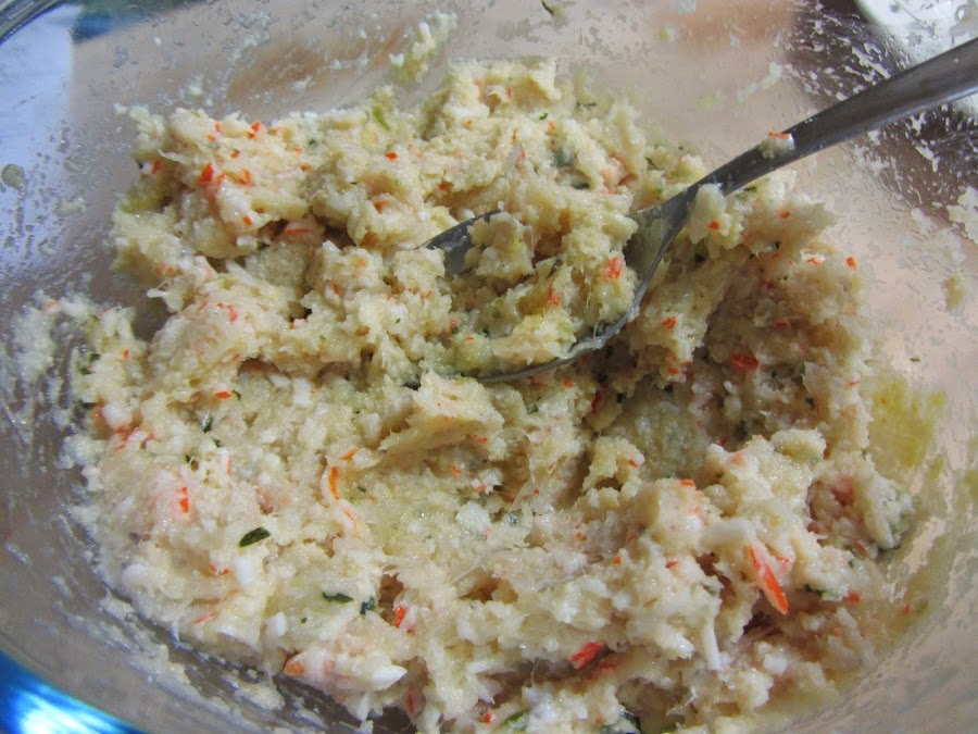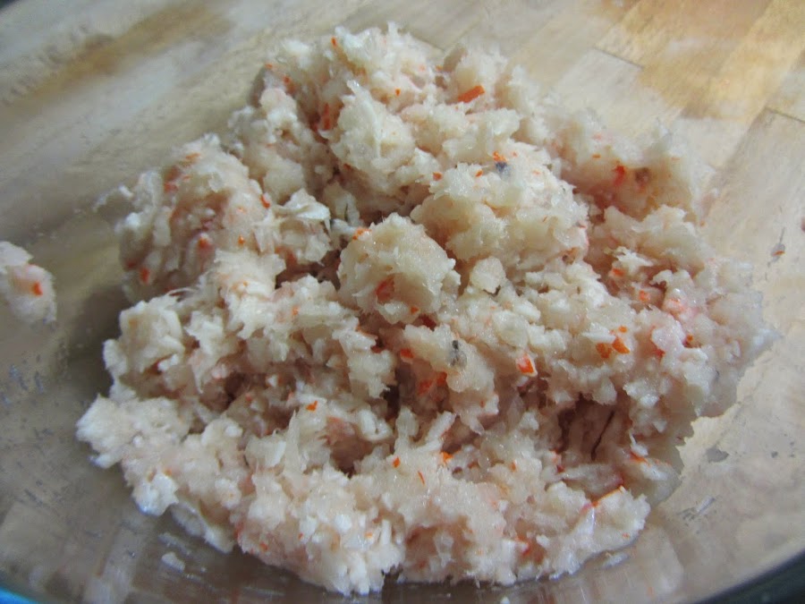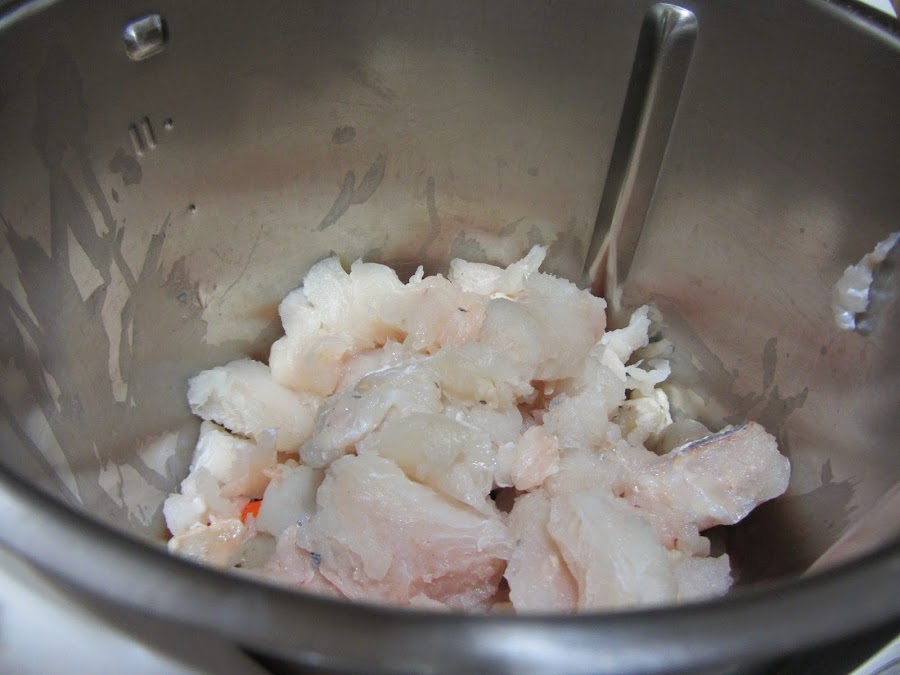 Picamos, con un robot de cocina, procesador de alimentos o picadora (o a mano, aunque así es un poquito trabajoso) la merluza, las gambas y el surimi.