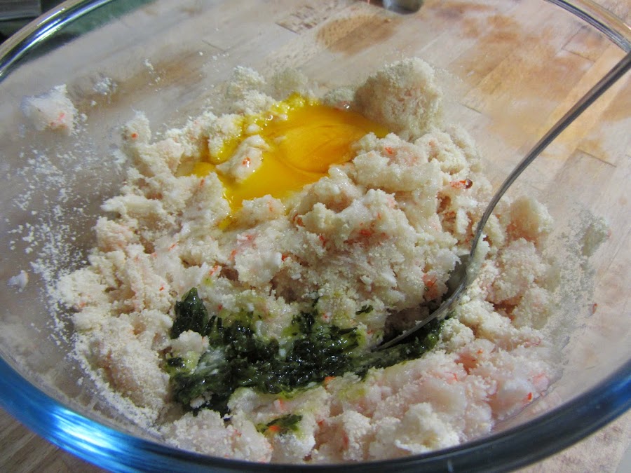 Colocamos en un bol la mezcla de pescados, y añadimos un huevo crudo, sal, pimienta, la leche evaporada, el perejil picado, y el pan rallado (poner primero 5 cucharadas, después se verá si hace falta más cantidad). Y mezclamos bien, primero con una cuchara y después con las manos.