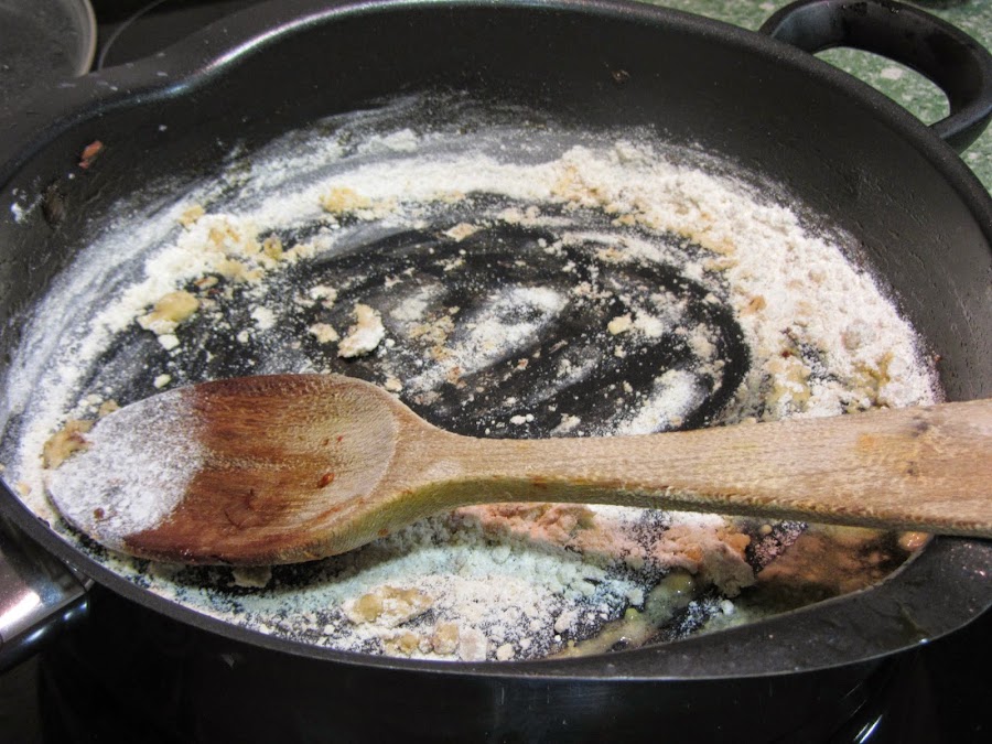 En la misma cazuela, tostamos las dos cucharadas de harina, removiendo para que no se pegue ni se queme.