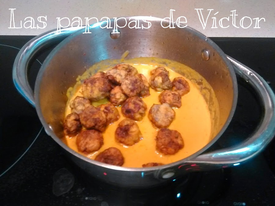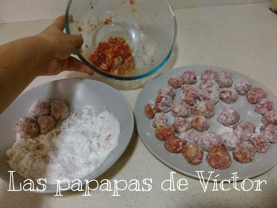 Triturar la salsa, hacer bolitas con la carne y pasarlas por harina y freírlas.