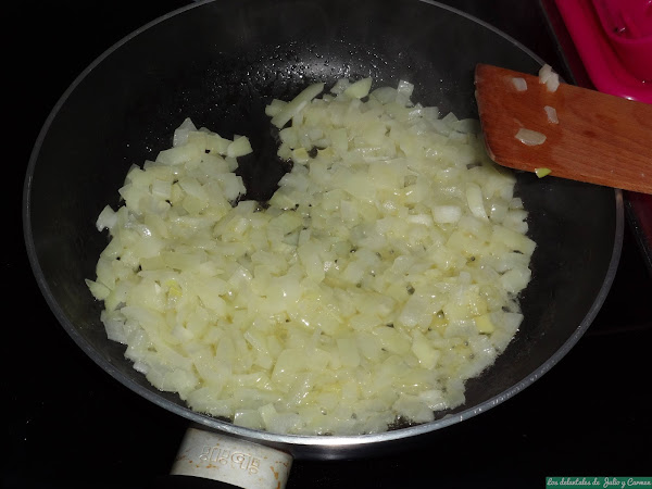 Picamos la cebolla finita y la pochamos en una sarten con la cucharadita de mantequilla y un chorro de aceite. Cuando la cebolla comience a dorarse, la retiramos y dejamos que se temple.