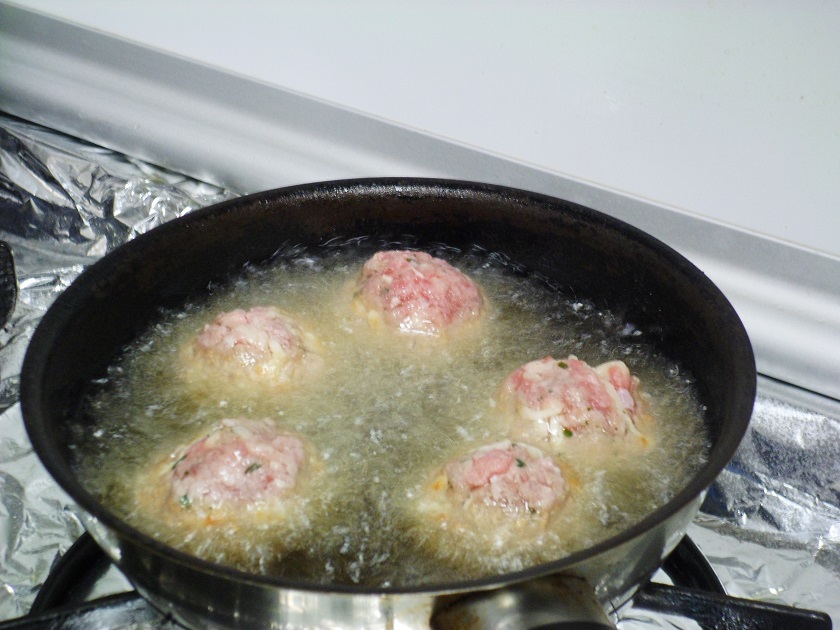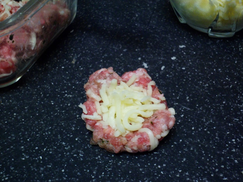 Ponemos una sartén con abundante aceite a calentar. Mientras vamos preparando las albóndigas, cogemos una cantidad de carne y en el centro ponemos el queso.