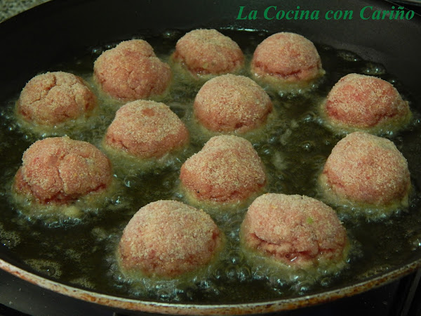 Ahora en aceite de oliva caliente, pero a fuego medio, freímos las albóndigas, metiéndolas en la salsa tras escurrirlas. No las queremos muy hechas, solo, que queden firmes. Cuando estén todas en la salsa, las metemos en el horno a unos 120-140ºC, durante media hora. Cuando estén listas, le añadimos la mantequilla para que la salsa quede brillante.