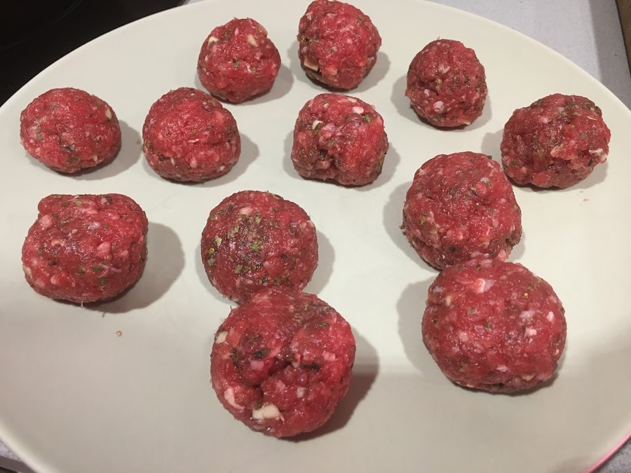 3. Con las manos húmedas, forma 16 bolas medianas con la mezcla de carne.
