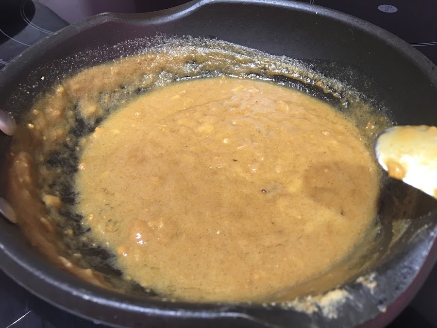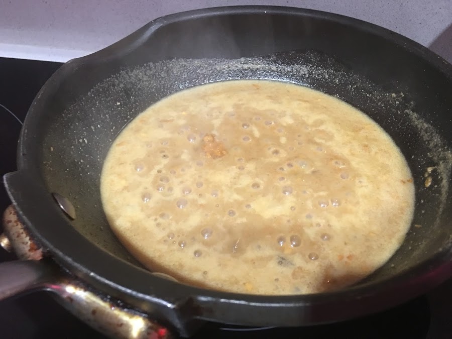 6. Añade el resto de ingredientes de la salsa y cocina todo a fuego medio durante 5 minutos. Removiendo de vez en cuando. Conforme vaya pasando el tiempo la salsa irá espesando.