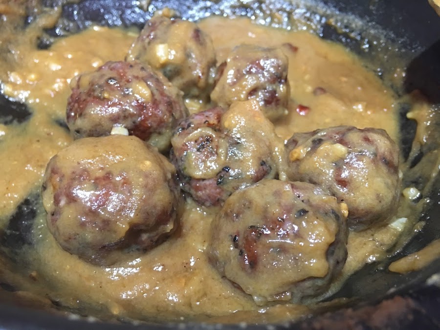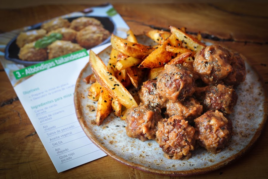 Son unas albóndigas marinadas con salsa de cacahuete, coco y de pescado, una mezcla muy asiática, sorprendente y deliciosa.