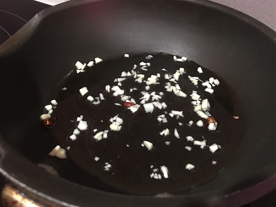 5. Prepara la salsa: escurre el aceite de las sartén que has utilizado para freír las albóndigas, sofríe el ajo picadito a fuego medio/bajo junto con el jengibre troceado y el chile.