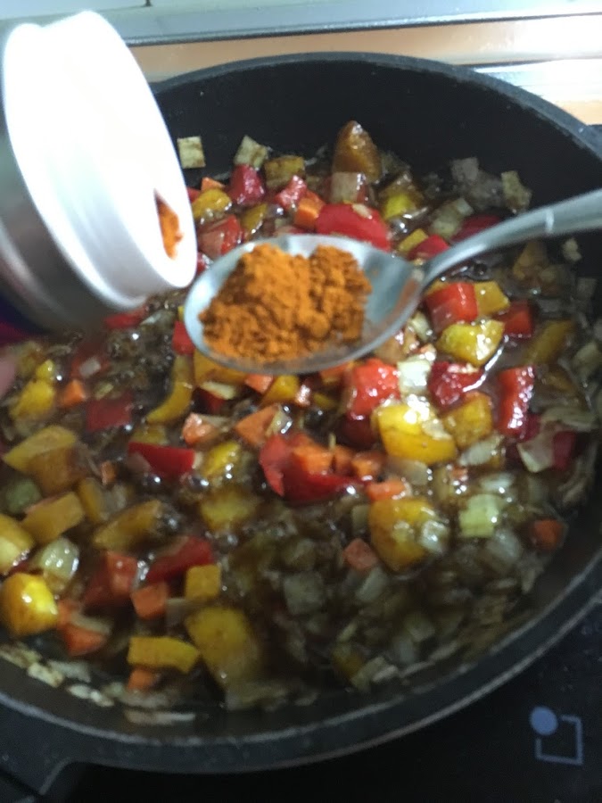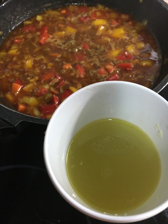 Se escurre el aceite y se añade una taza de caldo de verduras. Se vierte esta mezcla en la cazuela de las albóndigas.