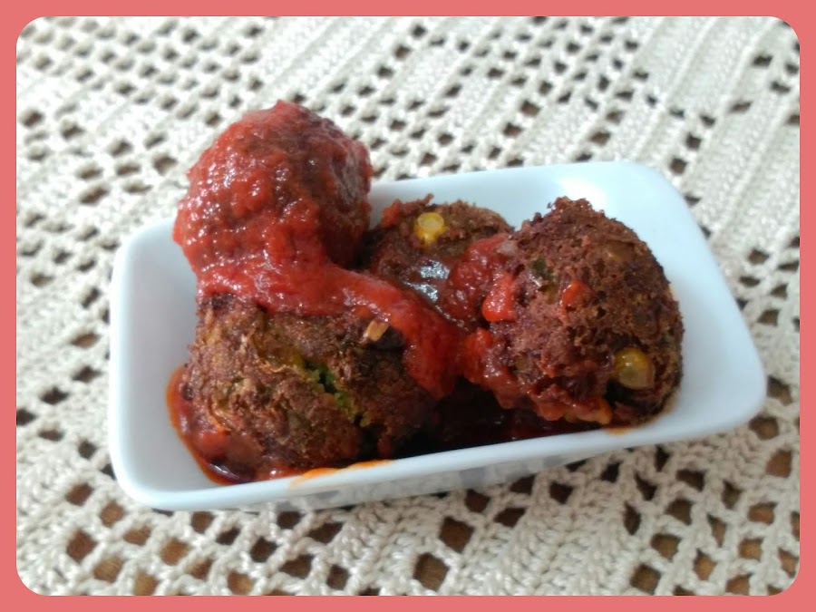 4.- Precalienta el horno a 200ºC. Mientras se calienta ve formando las albondigas con las manos impregnadas en zumo de limon, pasalas por la harina de garbanzos o semolina. Colocalas en una bandeja de horno con papel de hornear y hornea durante 15 min a 180º y voltea las albondigas y otros 10 min misma temperatura. (el tiempo dependera un poco de lo grandes que las hayas hecho.
