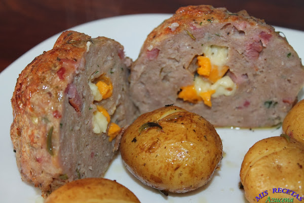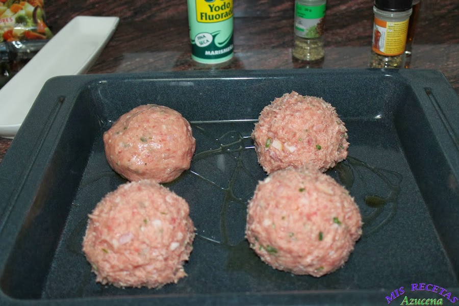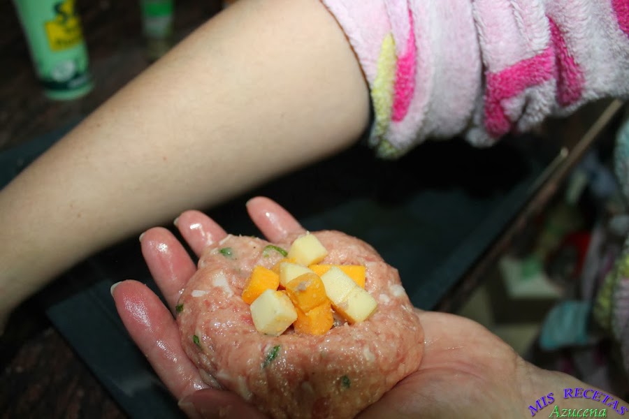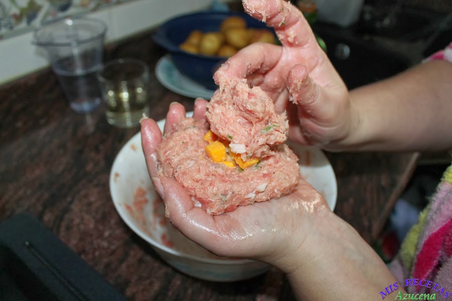 Ahora cogemos de cada parte la mitad y hacemos una bola, cuando la tenga lista aplastaremos un poco para poner el queso, este no te pongo cantidad ni tipo, es al gusto de cada uno, cuando lo tengas puesto cogemos la otra mitad de la carne que teníamos reservada y la ponemos encima, terminamos de crear la albóndiga y la colocaremos en la bandeja de horno, repetiremos estos pasos hasta crear las 4 albóndigas.