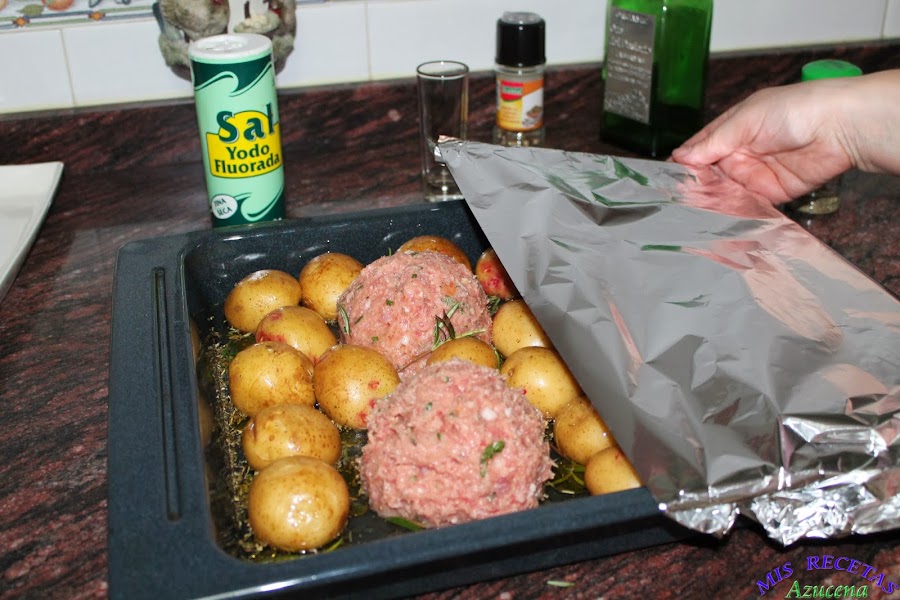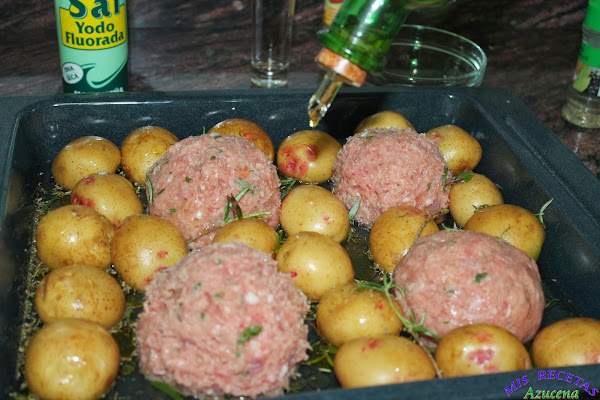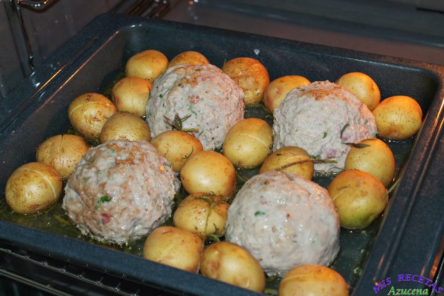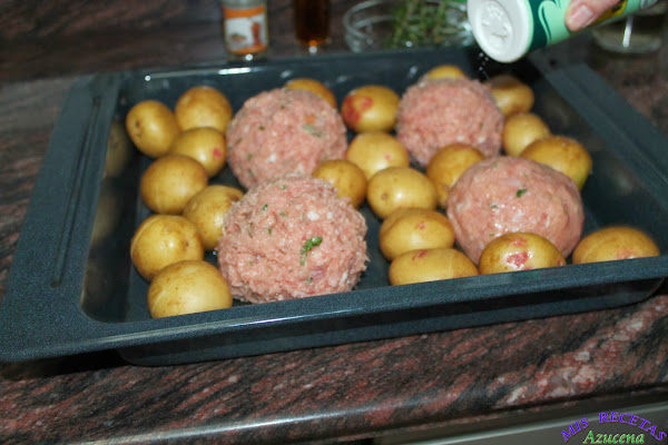 Cuando falten 10 minutos para terminar abriremos el horno y le daremos la vuelta a las albóndigas y removeremos las patatas.