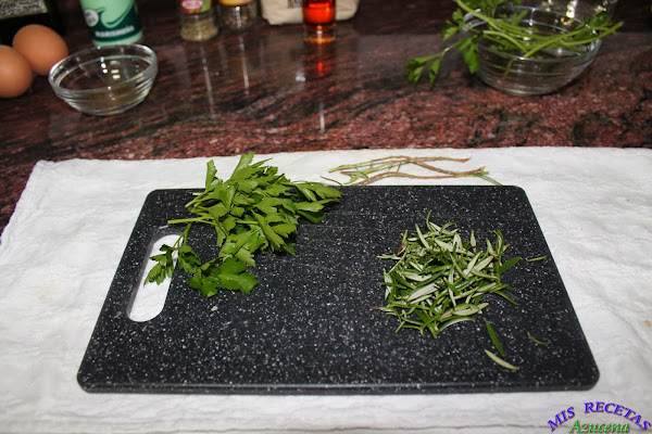 Lavaremos el romero y el perejil, el romero lo lavaremos con agua caliente para ello abrimos el grifo del agua caliente y lo ponemos un momento debajo ya verás cómo empieza a soltar todo el aroma, le quitaremos el tallo y picaremos solo las hojas, añadimos al bol, el perejil lo picaremos del mismo tamaño que el romero, también lo añadimos.