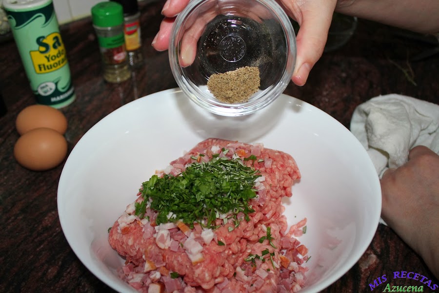 Ya solo nos falta añadir las especias, los dos huevos, el pan rallado, salpimentamos y mezclamos todo bien.