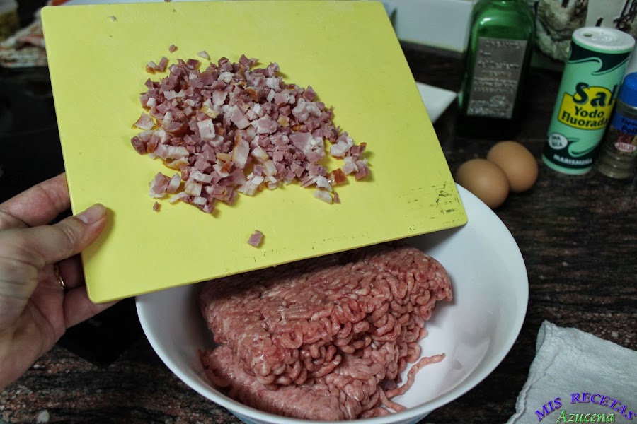 Ahora cogemos el beicon, lo picaremos en cuadraditos pequeños y se lo añadiremos al bol donde tenemos la carne picada.