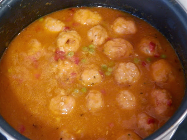 Cuando tengamos el sofrito, ponemos agua en una cacerola y cuando empiece a calentarse añadimos el sofrito completo y los guisantes. Dejamos cocer todo junto por diez minutos y a continuación añadimos las albóndigas.