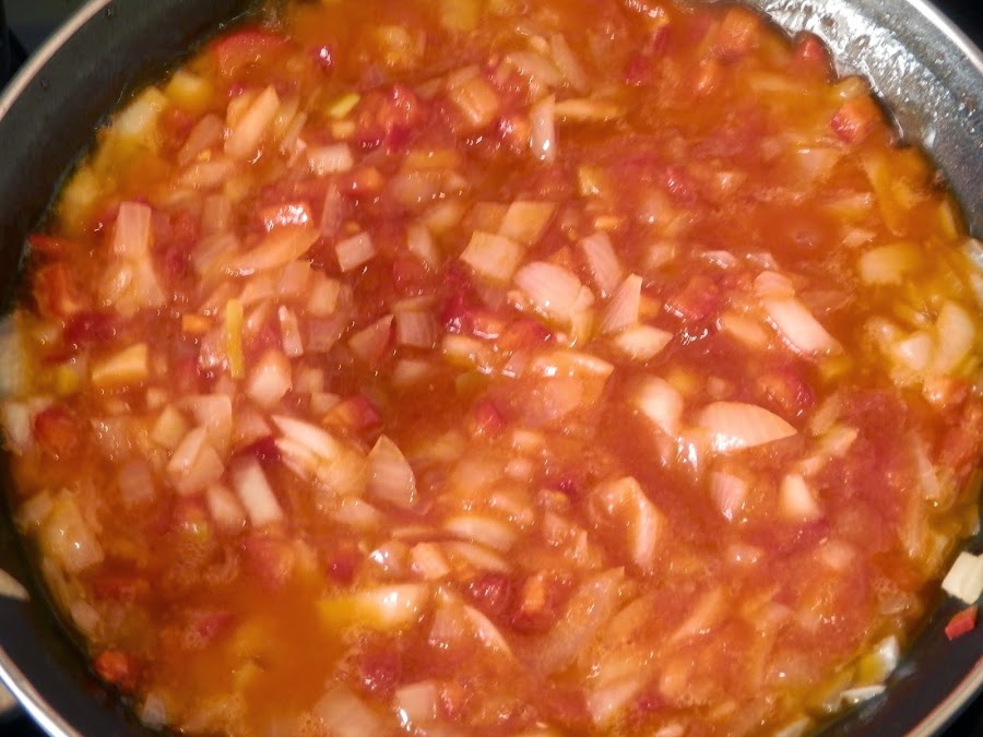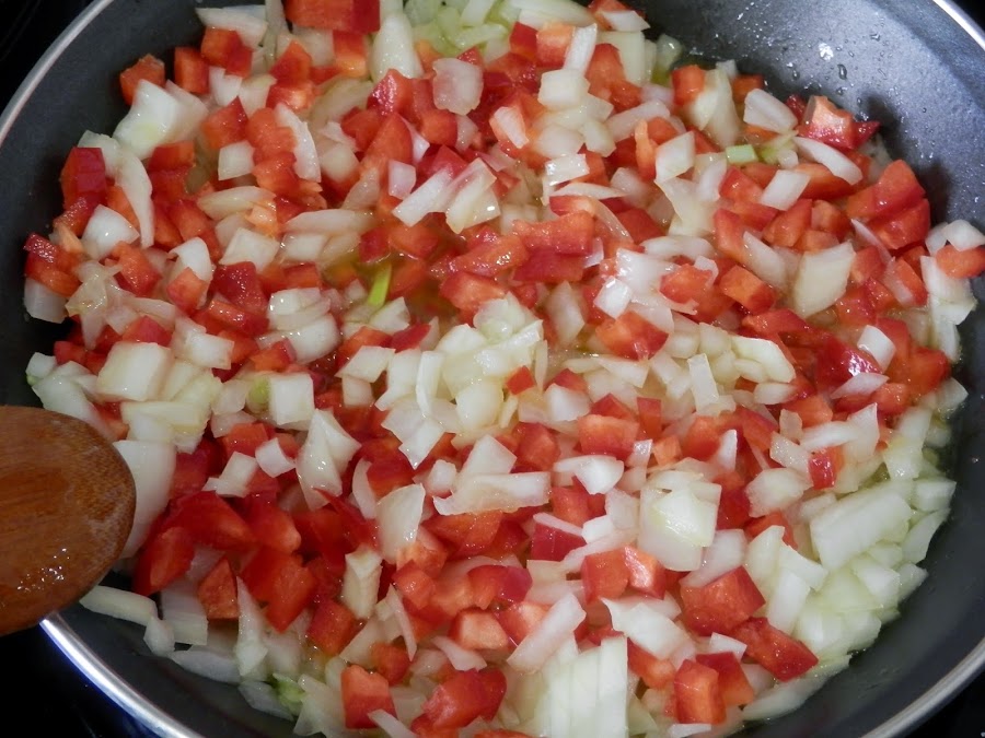 Ponemos en el aceite la cebolla y el pimiento picado muy pequeño y sofreímos, añadimos el tomate triturado y dejamos hacer.