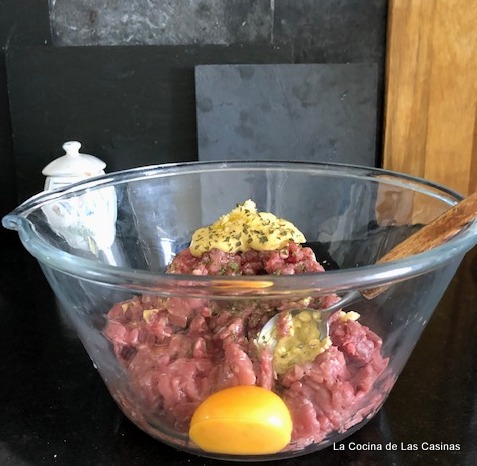 Pide en la carnicería que te piquen las carnes, a mí me gusta que le den dos pasadas. En un bol amplio añades a la carne un diente de ajo muy picado, la mostaza, el huevo y las claras, elperejil muy picado y la miga de pan que has remojado en salsa de soja. Si es necesario rectifica de sal.