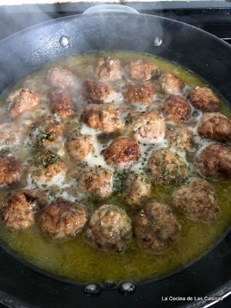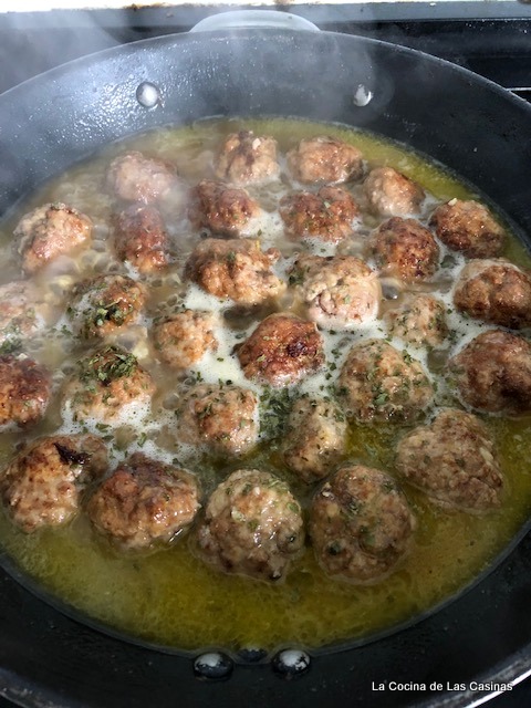Retira el aceite vegetal y limpia la sarten con papel de cocina (odio usar muchos cacharros). Cubre la base de tu sarten o cazuela con el AOVE, añade el otro diente de ajo muy picado, rehoga e incorpora la cucharada de harina. Deja que se haga un poco sin que se pegue para quitarle el sabor a la harina. Añade las albóndigas, mezcla e incorpora el vino y el agua hasta casi cubrir. Espolvorea con perejil picado.