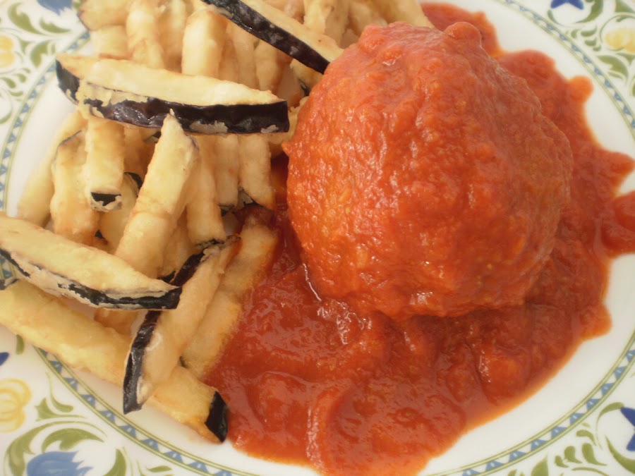 Las albóndigas las acompañé con berenjenas fritas, tal y como le gustan a mi marido. Curiosamente hace unos días subí la foto a las redes sociales y a un magnifico cocinero, Juan Carlos, con un blog de cocina fantástico Gastronomia en Versoal que sigo y admiro, le llamó la atención y así me lo comentó. Pensé que las berenjenas merecían una entrada en ?Mi cocina? para ellas solas, que el albondigón le restaba protagonismo; espero que las berenjenas no me lo tomen a mal?.y quienes siguen mis recetas las tengan en cuenta y las valoren en su justa medida. Vamos, que si nunca las han probado, las preparen y las disfruten.