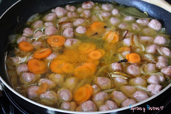 Cuando hayan perdido el color a crudo, agregamos el vino, el agua, la zanahoria en rodajas finas, el laurel, clavo, pimienta y la pastilla de caldo desmenuzada.