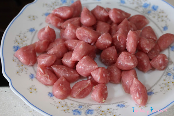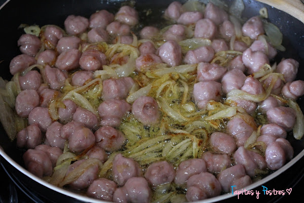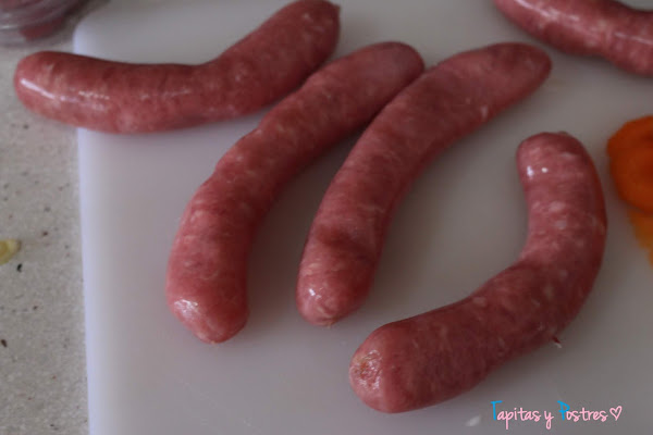 Estábamos en casa de mi madre, mi hermana y yo preparando la comida. En la nevera encontramos unas longanizas de pollo que había que gastar asi que no pusimos a pensar en prepararlas en salsa, pero como mi madre está algo delicada decidimos cortarlas en trocitos para que fuera mas fácil para ella comerlas. Y a medida que las estábamos guisando se me estaba ocurriendo que podía ser una buena receta para poner en el blog.