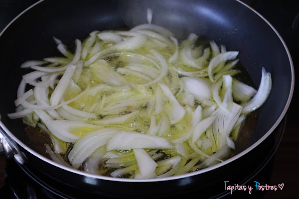 Ponemos aceite de oliva en una sartén o cazuela grande. Cortamos la cebolla en tiras y la pochamos en el aceite.