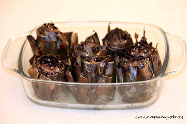 Sujetando las alcachofas por la base, golpeamos la parte superior sobre la encimera para que se abra y así facilitar el acceso de sal y aceite a su interior.