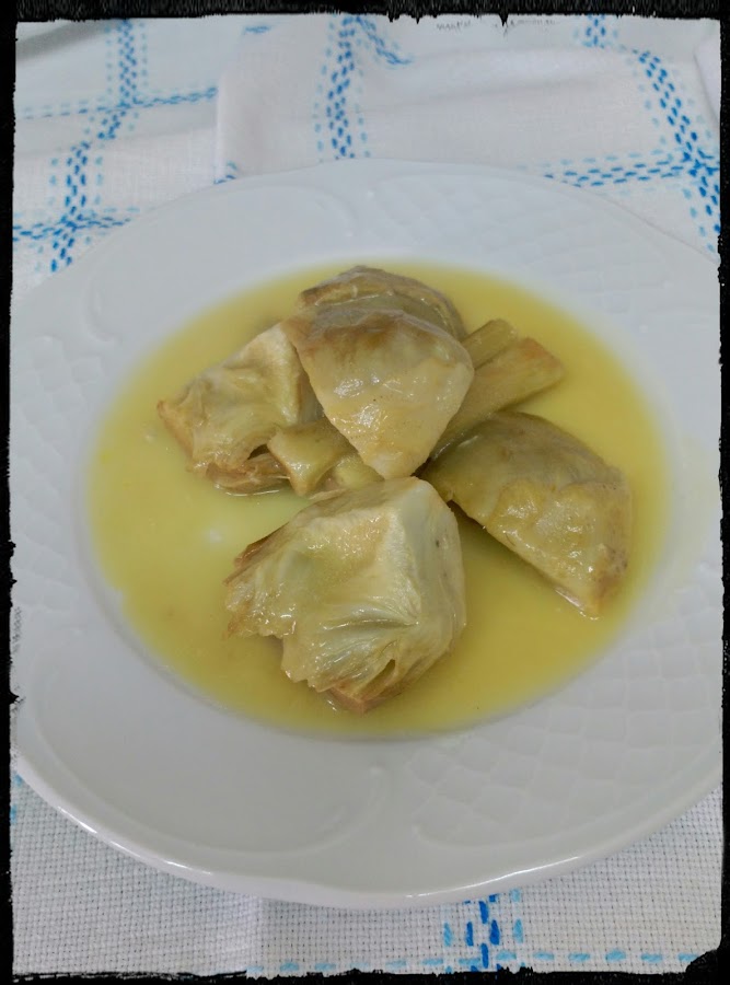 1.- limpia las alcachofas, cortalas en cuartos o mitades (a tu gusto) y dejalas en agua con la ramita de perejil o el medio limon para que no se ennegrezcan.