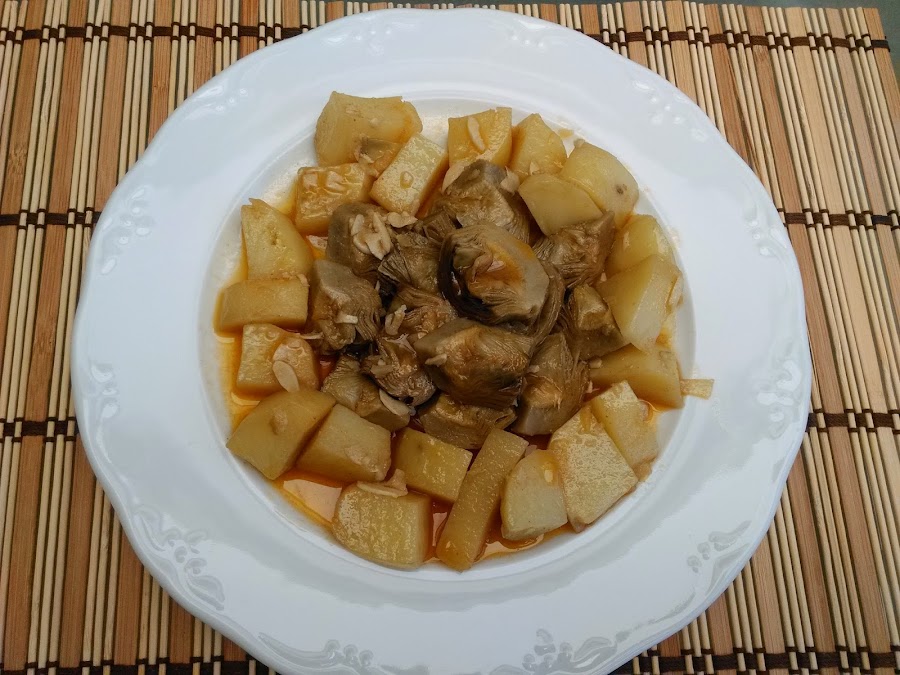 Incorporamos las alcachofas, las patatas escurridas y el comino, removemos un par de minutos.
