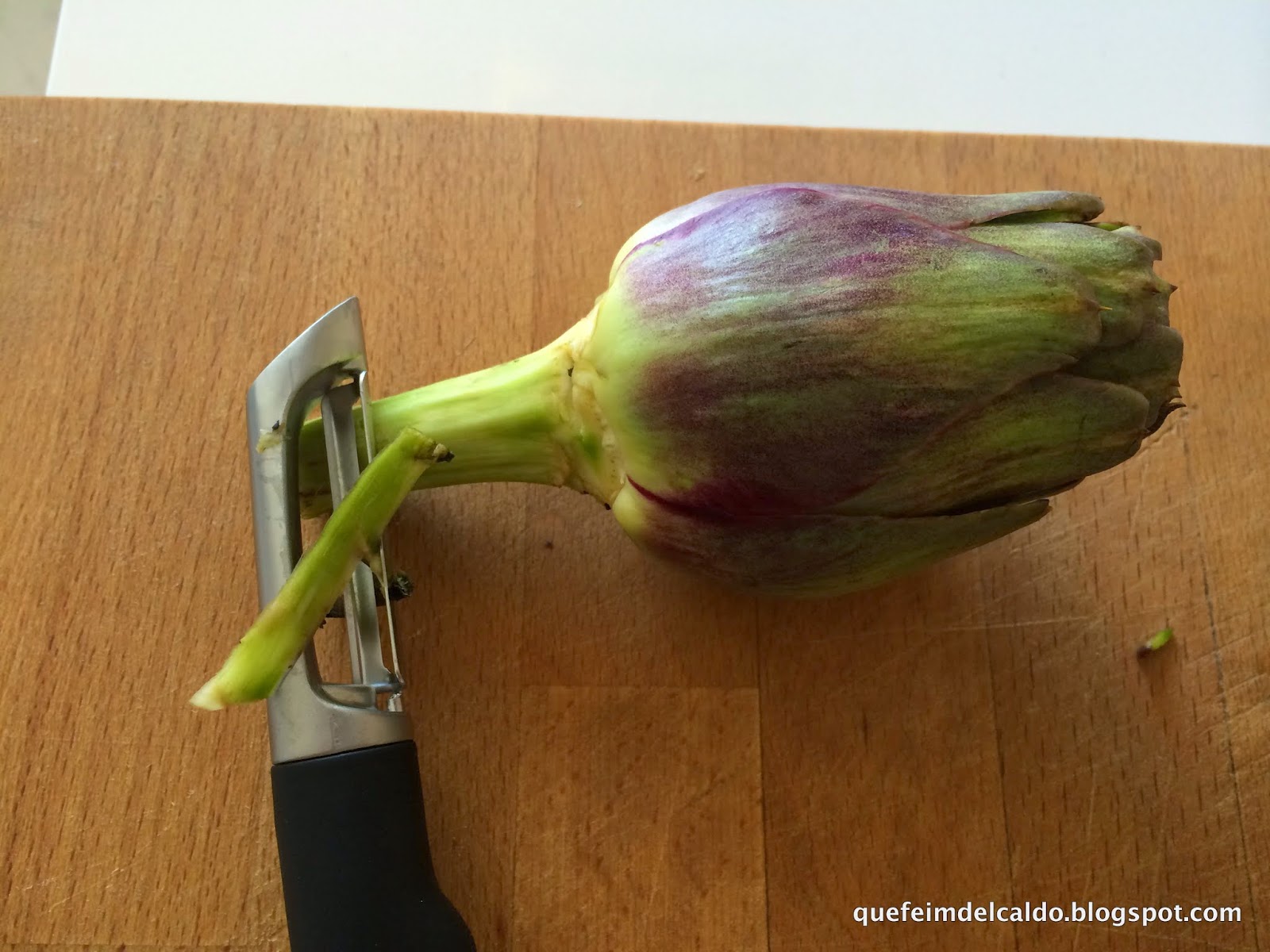 Cortamos las hojas de la base de la alcachofa y las pelamos de nuevo con el pela verdura.