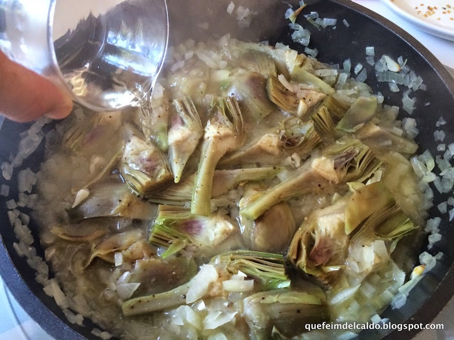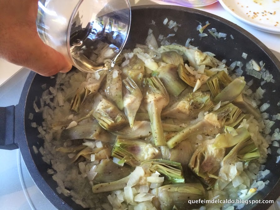 150 ml. de vino blanco, le damos máxima potencia al fuego hasta que reduzca a la mitad los líquidos, hay que llevar mucho cuidado no quemar la alcachofa ni la cebolla.