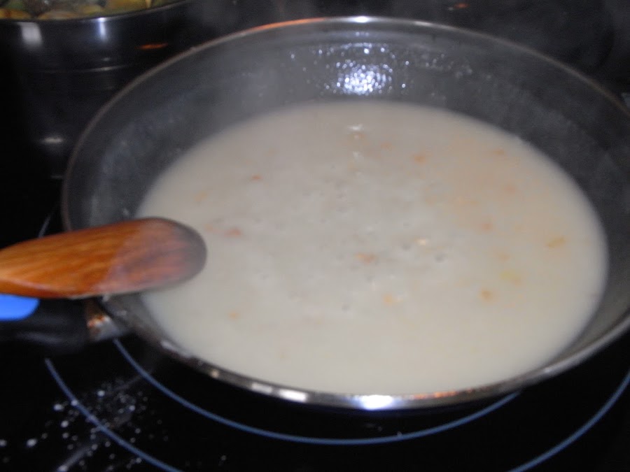 Mientras se van haciendo las alcachofas volvemos a la primera sartén donde se están pochando el ajo y la cebolla y añadimos una cucharada de harina y la sofreímos un poco, le damos unas vueltas y añadimos el caldo de pescado para hacer una velouté (que es como una bechamel pero en vez de leche utilizamos caldo).