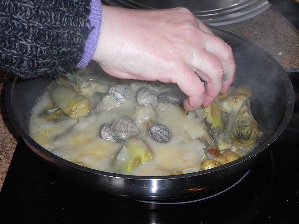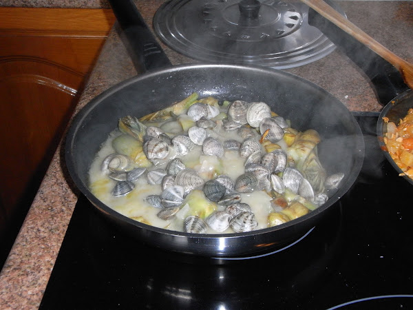 Ahora cuando las alcachofas están hechas y la velouté ha espesado un poco se unifica todo en una sartén, yo suelo verter la velouté sobre las alcachofas y añado las almejas, se remueve un poco, se pone a fuego vivo y se tapa para que se abran las almejas, siempre controlando para que no se pegue a la sartén por la harina de la velouté.