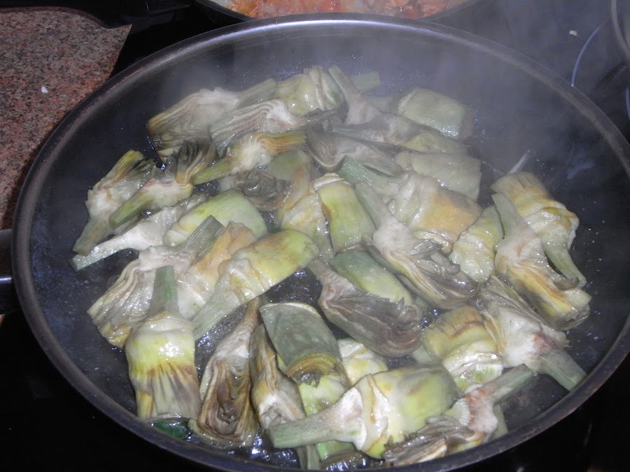 Ponemos otra sartén al fuego con las alcachofas escurridas, medio vaso de agua, sal y un chorretón de aceite de oliva, se tapa y se dejan cocer, cuando estén ya un poco cocidas se destapa la sartén para que el agua se evapore y se remueven para que se doren un poco en el aceite que hay en la sartén.