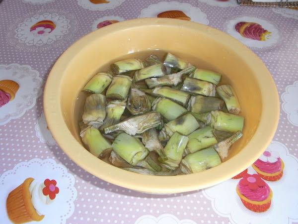 Después limpiar las alcachofas y cortarlas en seis trozos o en cuatro si son pequeñas, esto es lo que menos me gusta pero siempre procuro tener algún pinche de cocina que me ayude je, je.