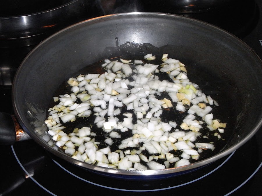 Cortamos el ajo y la cebolla todo bien finito y ponemos una sartén con aceite de oliva a fuego medio para que no se dore rápidamente sino que se vaya pochando.