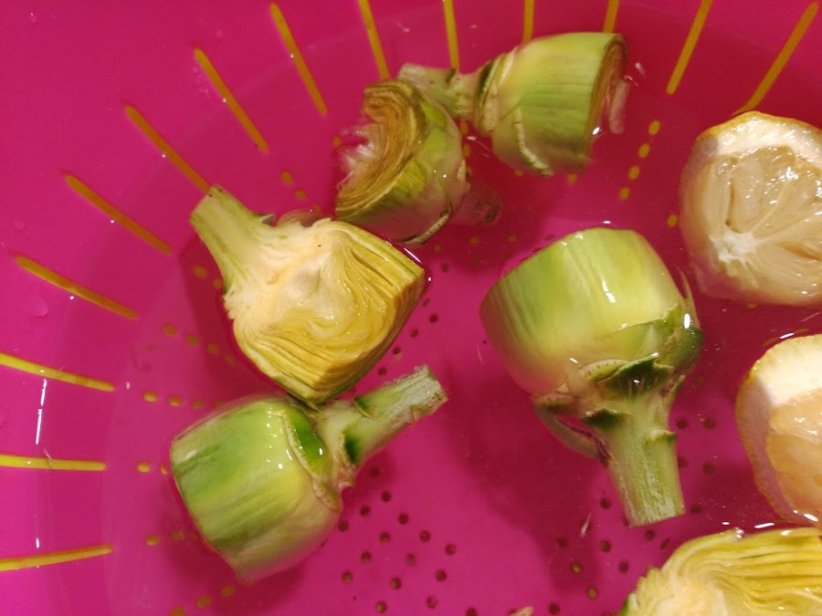 3.- Ponemos las alcachofas cortadas por la mitad a remojo con agua y el zumo de medio limón para que no se oxiden.