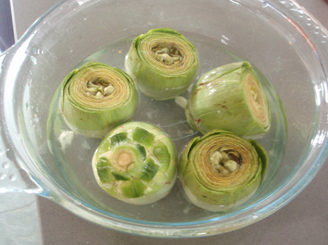 Pelamos las alcachofas eliminando sus hojas duras, les cortamos las puntas también duras y las vamos introduciendo en un cuenco con agua y el zumo de un limón para que no se ennegrezcan.