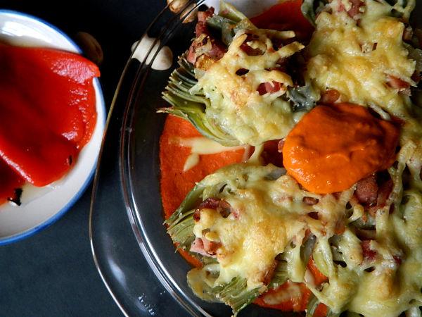 Receta de alcachofas con jamón en salsa de pimientos del piquillo