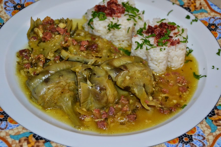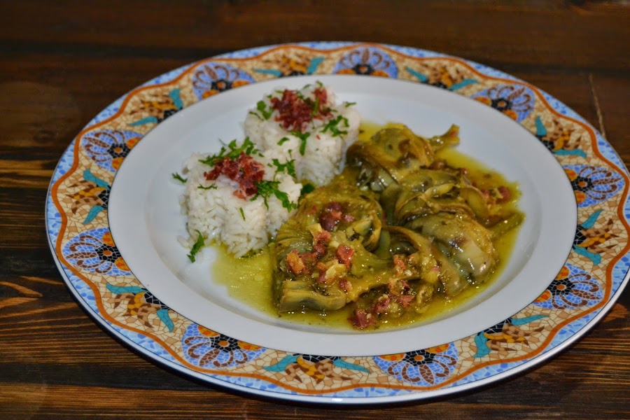 Yo la suelo acompañar siempre con un arroz blanco con perejil, pero con unas patatas cocidas o fritas están también de muerte. Es un plato sano, fácil y rápido de preparar, ya que las alcachofas se ponen tiernas en muy poco tiempo.