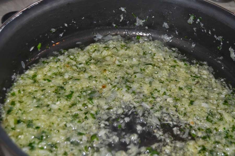 En una cazuela ponemos el aceite y echamos la cebolla y los ajos partidos muy pequeñitos, pochamos y por ultimo el perejil para que no se nos dore mucho.