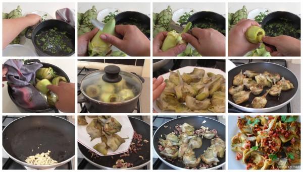 Cuando tengamos las alcachofas limpias las lavamos rápidamente y las pasamos a la cazuela con agua, tapamos y dejamos cocer durante unos 20 minutos hasta que esten tiernas pero no muy blandas, “al dentes” podéis comprobar si están pinchando con un cuchillo en el centro.