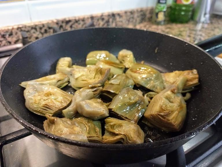 En la misma sartén que hemos preparado la cebolla con el jamón, echad un chorrito de aceite y saltead las alcachofas a fuego fuerte para que se doren un poquitín, un par de minutos. Salpimentadlas.