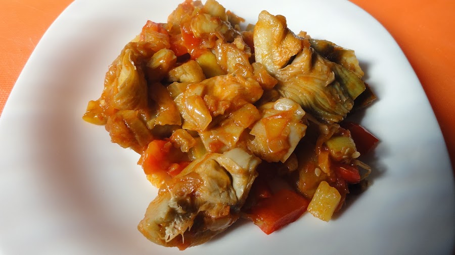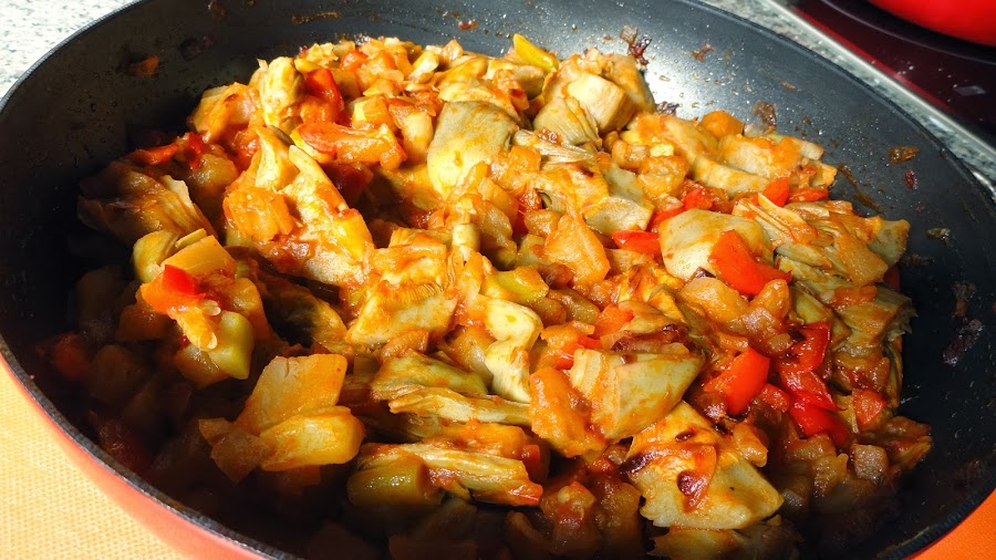 En una sartén ponemos a dorar el ajo laminado, la cebolla en brunoise, a continuación echamos el pimiento y cuando todo este refrito esté hecho, agregamos las alcachofas, el resto de verduras, y el tomate frito. Unas vueltecitas y listo.