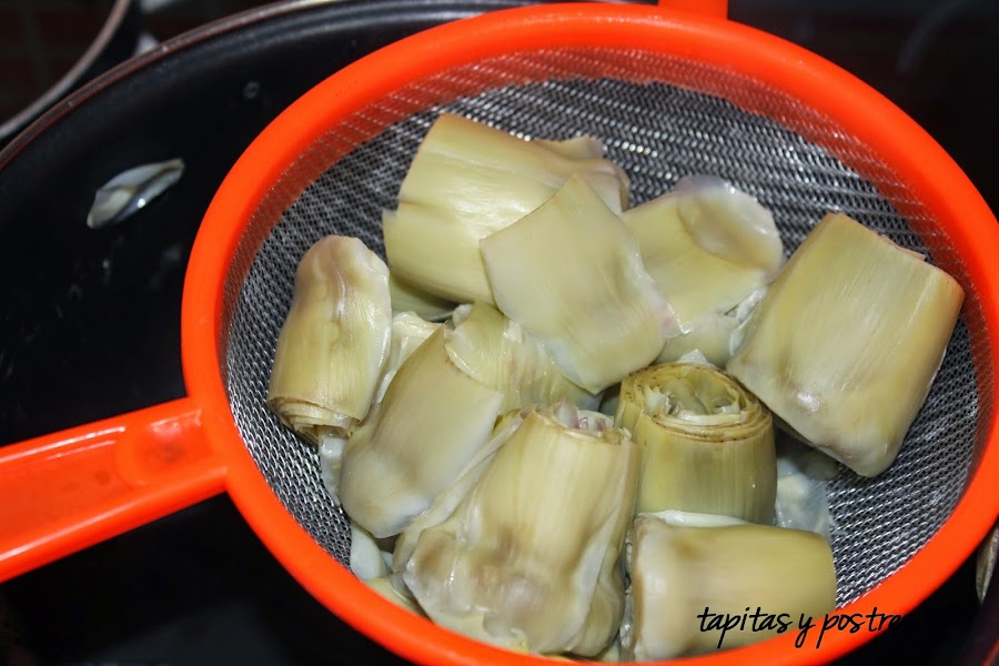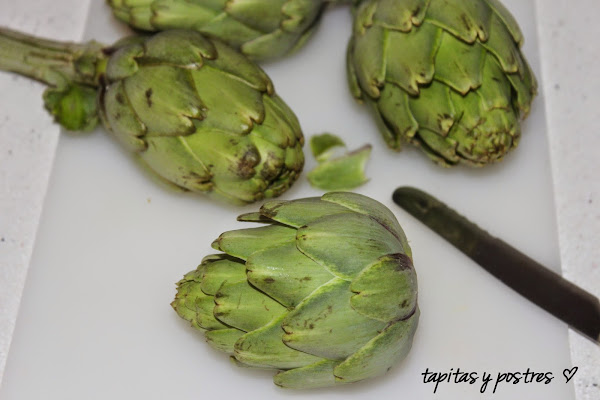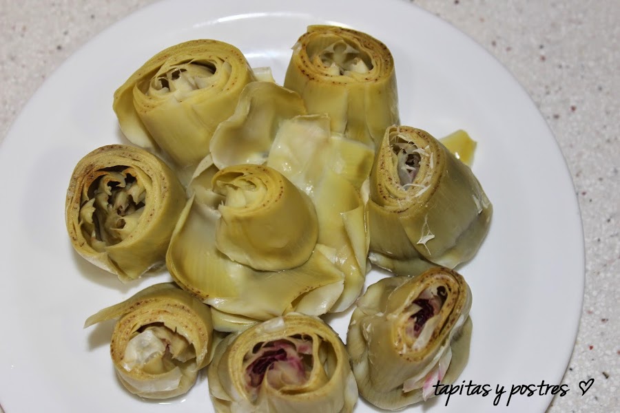 Pelamos las alcachofas y le quitamos todas las hojas duras hasta llegar la corazón.