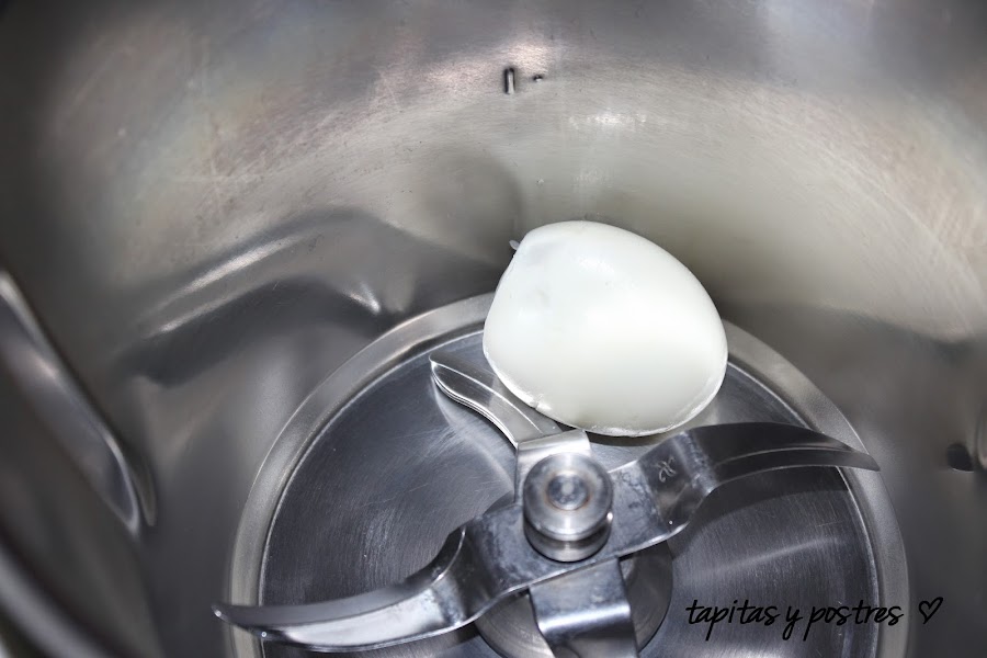 Ponemos el huevo ya cocido en la thermomix y picamos un segundo a velocidad 4, también se puede hacer a mano.