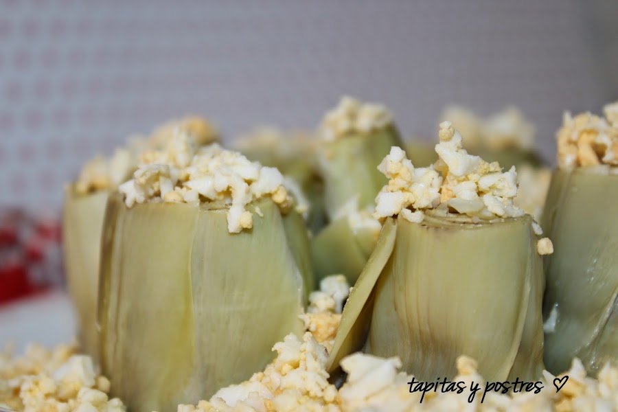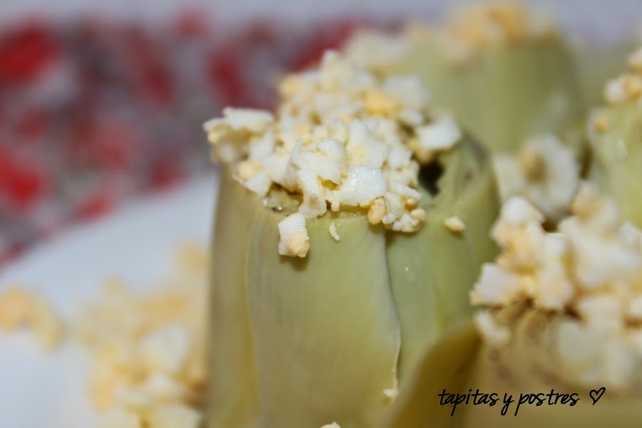 Ponemos el picadillo de huevo sobre las alcachofas y listo.